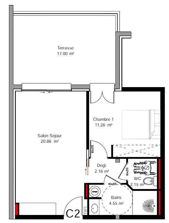 Ce T2 de 51 m² offre un séjour spacieux de 28m² et une chambre confortable. Sa terrasse